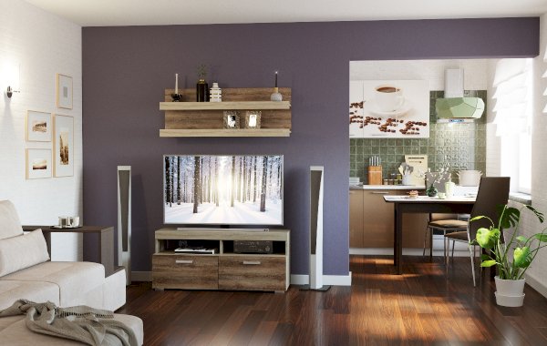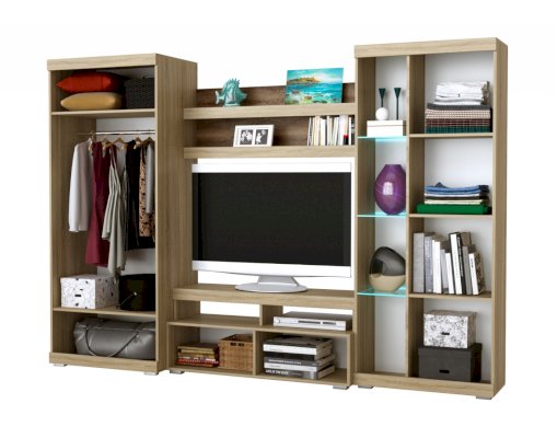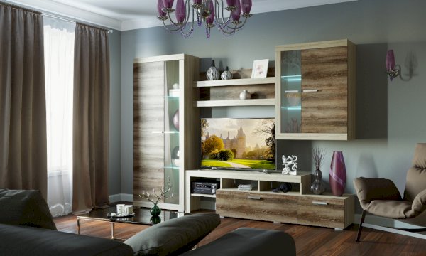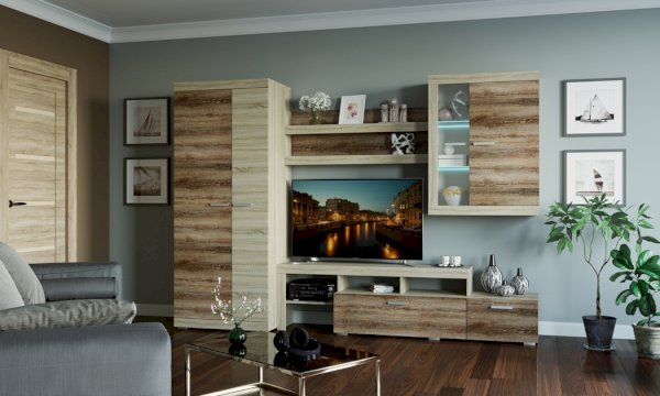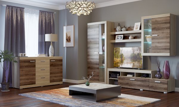 В гостиной Соната применяются современные европейские декоры: корпус выполнен из ЛДСП Дуб сонома, фасад из ЛДСП Дуб Сакраменто. Декоры отличаются выраженной тёплой древесной текстурой, а фасадная часть подчёркнута горизонтальными линиями текстуры и стильными планками МДФ, представляющими собой элементы корпуса и фасада.