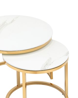 Два журнальных столика с круглой столешницей под мрамор разного размера в наборе. Столешница выполнена из закаленного стекла. Каркас изготовлен из нержавеющей стали с гальваническим покрытием с применением нитрида титана. Такое покрытие обладает рядом преимуществ: