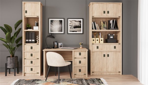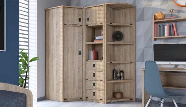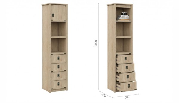 Пенал с открытыми и закрытыми полками служит для хранения учебников, тетрадей и других письменных принадлежностей. Декоративные накладки и профиль из МДФ по вертикальным краям закрывают острые края корпуса и придают шкафу более эффектный и надежной вид. Декоративные элементы на фасаде и металлические ручки MARINE бронзового цвета стилизованы под морскую тематику. Идеально компонуется со всеми модулями системы Валенсия.